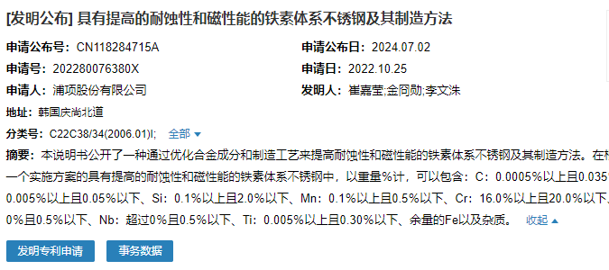 2024年7月2日,浦項股份有限公司成功申請一項名為“具有提高的耐蝕性和磁性能的鐵素體系不銹鋼及其制造方法”專利,申請公布號CN118284715A,申請日期為2022年10月25日。