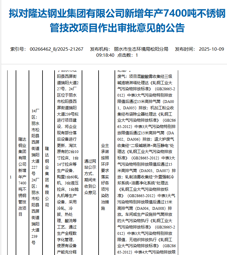 2025年10月9日,麗水市生態環境局松陽分局擬對隆達鋼業集團有限公司新增年產7400噸不銹鋼管技改項目作出審批意見并對外進行公告,公告期為:2025年10月9日至2025年10月14日(5個工作日)。